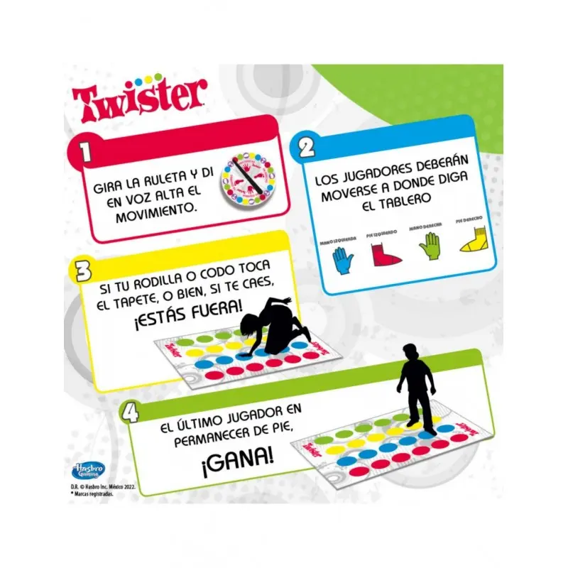 Con un tapete lleno de colores vibrantes y un spinner que dicta cada movimiento, los jugadores deben colocar manos y pies en diferentes círculos sin perder el equilibrio. Es un desafío físico lleno de risas y momentos inesperados, ideal para familias y grupos de amigos. Perfecto para romper el hielo en reuniones, estimular la actividad física y garantizar horas de entretenimiento. Twister es más que un juego, es una experiencia de diversión garantizada que une a todos en una competición llena de risas y diversión.